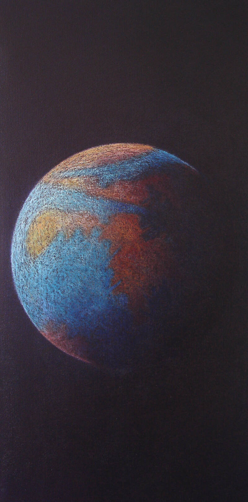 Que dire de ces mappemondes? Elles flottent, immobiles, dans cette vacuité pigmentaire où les noirs et les bruns se conjuguent,ce n’est que le globe terrestre tel qu’on le représente. C’est une image qui a pris consistance, comme si la peinture lui avait insufflé une nouvelle faculté de voyager dans l’espace . Voici une sphère colorée tout ce qu’il y a de plus conforme à son image, elle s’élève dans le firmament pour demeurer en suspens, énigmatique, pour ne plus en bouger. A mesure qu’il avance dans sa réflexion, le peintre commence à modifier imperceptiblement les contours caractéristiques des continents, il les rend plus indécis, plus flous. Il les fait se dissoudre dans la matière, se contentant d’un jeu entre les bruns de la terre et les bleus des océans. Peu à peu, les cinq continents se dissolvent. Ils ne sont plus tout à fait reconnaissables. Enfin, ils s’anamorphosent et perdent toute relation évidente avec ces points du globe où l’on étudie la géographie de notre monde. C’est désormais une planète qui n’appartient plus qu’aux caprices et aux fantasmagories de l’auteur de ces mappemondes oniriques. Il tient néanmoins à maintenir une ambivalence trouble et confondante entre le crédible et l’incroyable. La substitution n’est pas visible du premier coup d’œil. Ce faisant, il jette un pont secret entre l’enfance qui a laissé derrière lui, mais qui a trouvé refuge dans une île cachée au fin fond de son cerveau. Cet instant où il se confronte avec la toile et doit prendre la décision qui change son caractère et son intensité. Ce qui se pense dans la peinture ne peut que prendre les couleurs d’une autobiographie en filigrane. Mais c’est aussi une vision du temps présent : dans l’une de ses œuvres récentes, l’artiste attribue des formes explicites aux continents, les changeant en des soldats au combat, chacun d’entre eux devant affronter l’autre avec acharnement. Sans doute assiste-t-on à une mutation déterminante de l‘orientation de son œuvre.